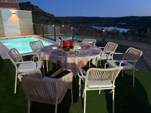 Three-Bedroom HouseGuests will have a special experience as this holiday home provides a pool with a view. Featuring a private entrance, this air-conditioned holiday home is comprised of 1 living room, 3 separate bedrooms and 2 bathrooms with a shower and a hairdryer. In the well-equipped kitchenette, guests will find a refrigerator, a dishwasher, an oven and a microwave. The spacious holiday home offers a washing machine, soundproof walls, a coffee machine as well as a terrace with lake views. The unit offers 7 beds.